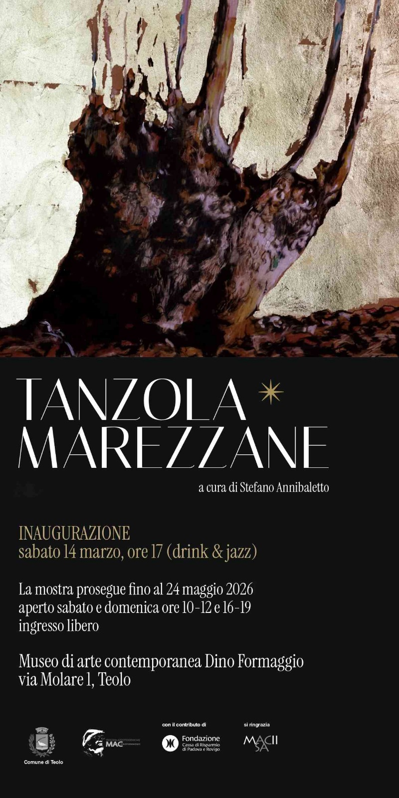 News Sabato 14 marzo verrà inaugurata la mostra personale "TANZOLA_MAREZZANE" presso il Museo di Arte Contemporanea Dino Frmaggio di Teolo. L'esposizione rimarrà aperta fino al 24 maggio 2026 ********************
